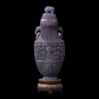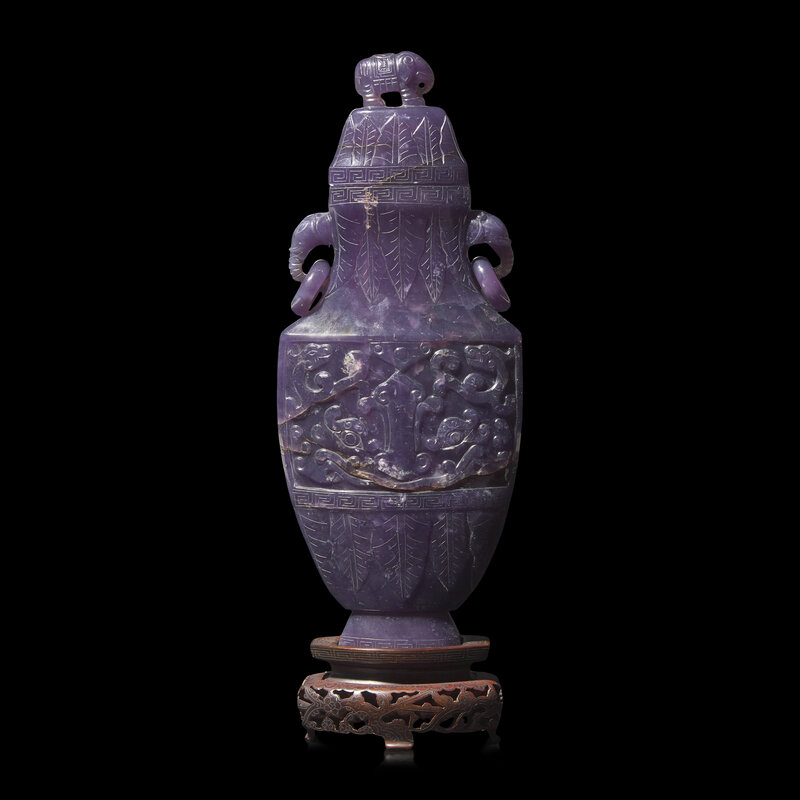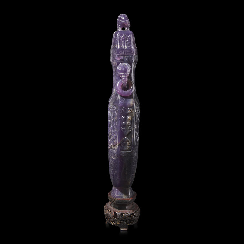 Of flattened flask-form, carved with archaistic taotie masks and qilong, the elephant head handles with suspended rings, an elephant finial to the cover, the stone of an enhanced violet hue; carved wood stand with silver wire inlay.