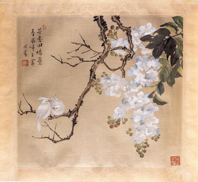 款識:芳意回嬌蕊,春風啼玉禽。心畬。