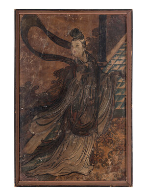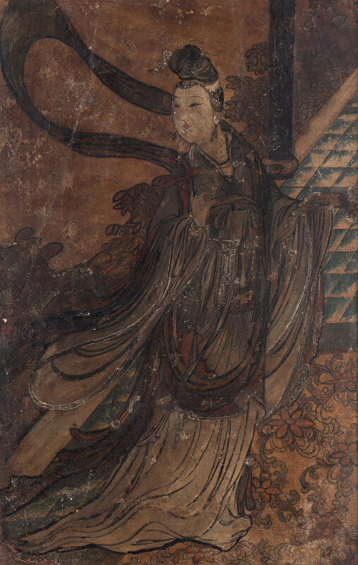 The immortal is shown with hair tied up in a high coiffure and wearing long, celestial scarves.