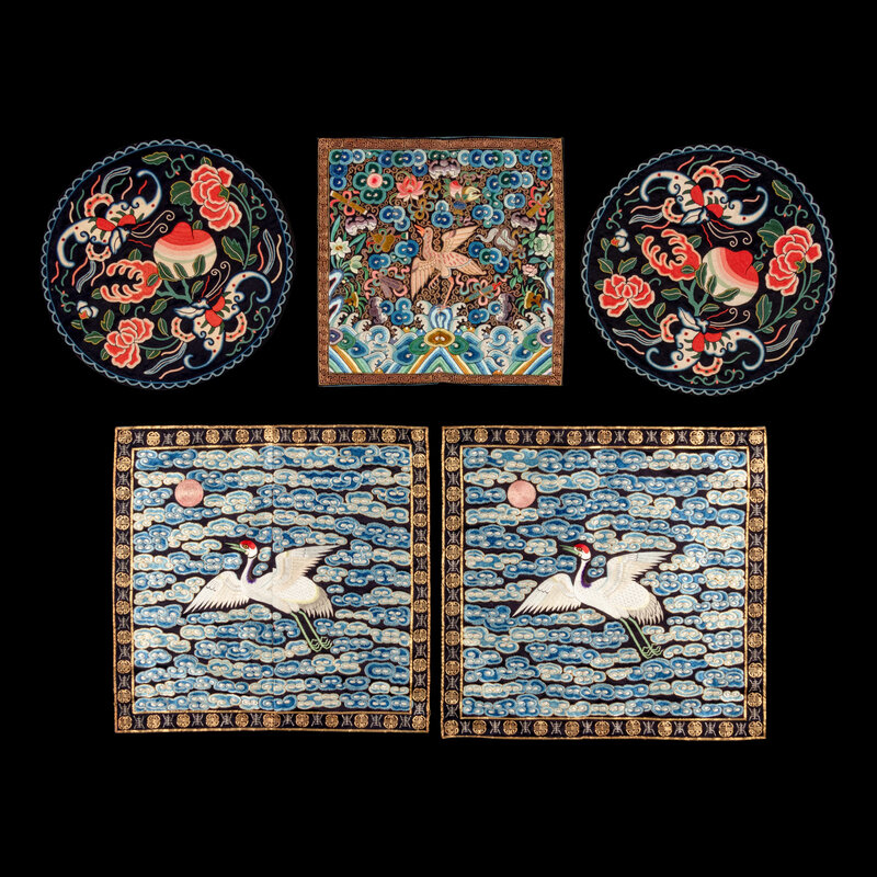 Comprising a pair of crane badges, a wild goose badge and a pair of 'three abundances' roundels.