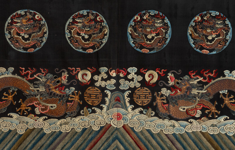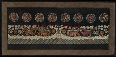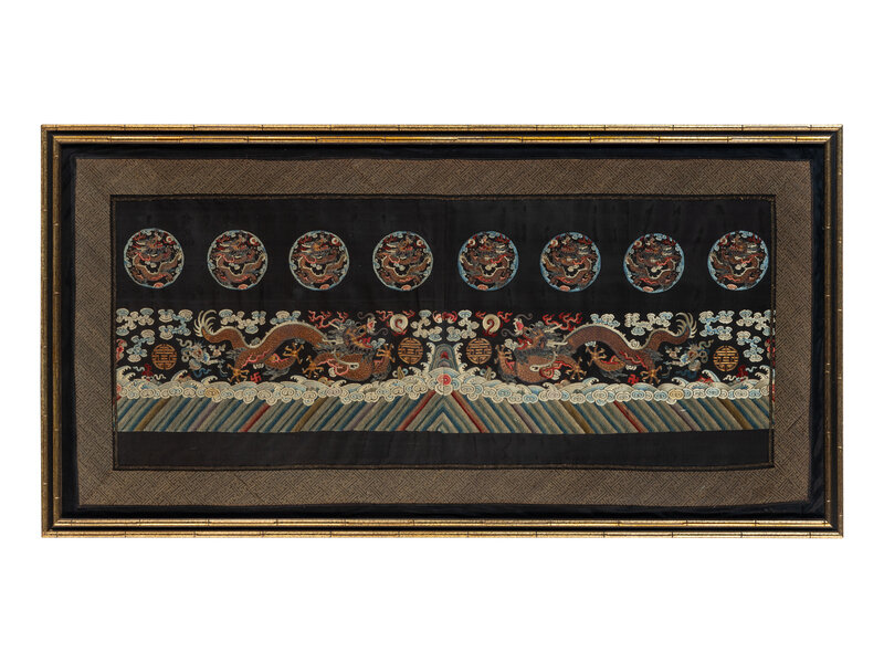 The rectangular section, worked in couched gilt-wrapped and polychrome threads to show eight dragon roundels against a black ground above confronting dragons, framed and glazed within a border of keyfret diaper trim.