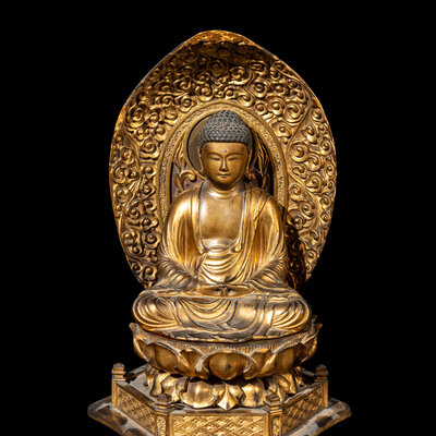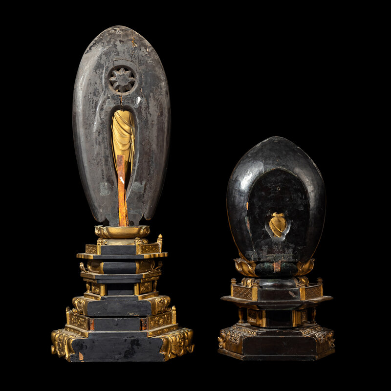 The standing deity with his hands displaying the Amida mudra, supported on a lotus pedestal raised on an elaborate plinth. The seated deity in a pose of meditation, supported on an open lotus raised on an elaborate galleried pedestal.