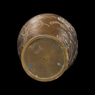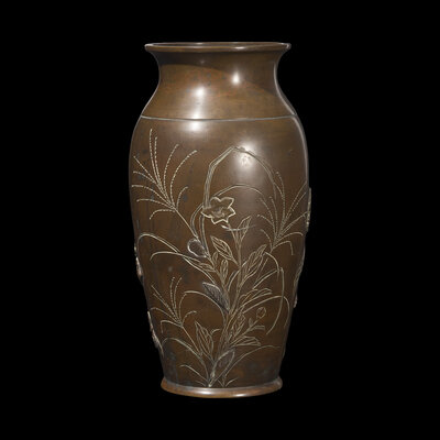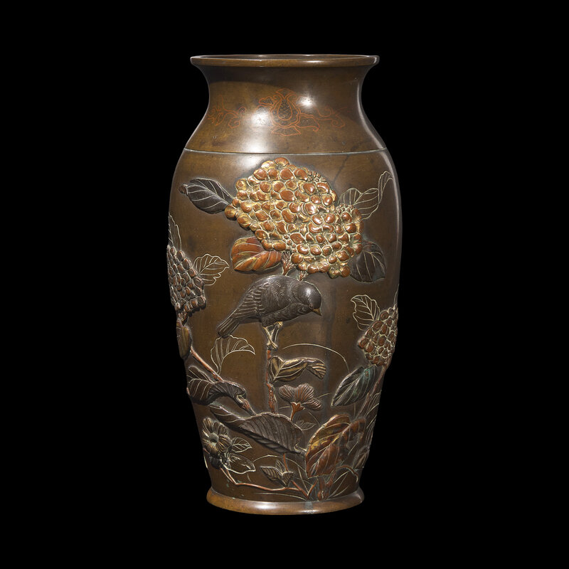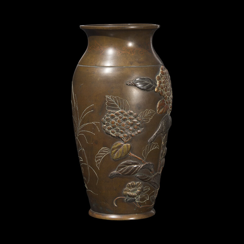A Japanese Mixed Metal and Patinated Bronze Bird and Flowers Vase, Meiji Period