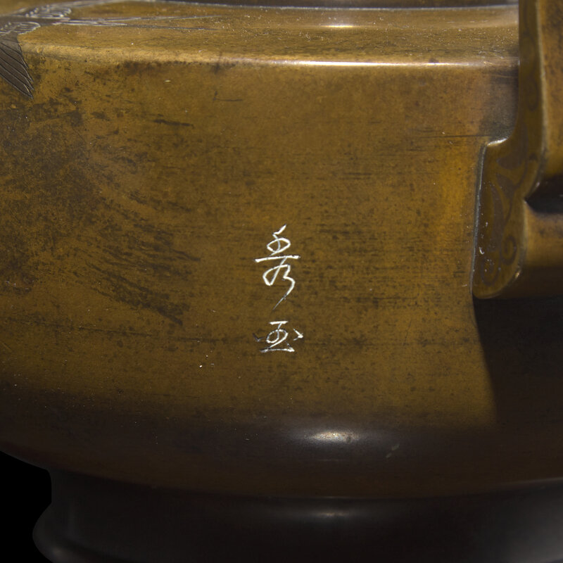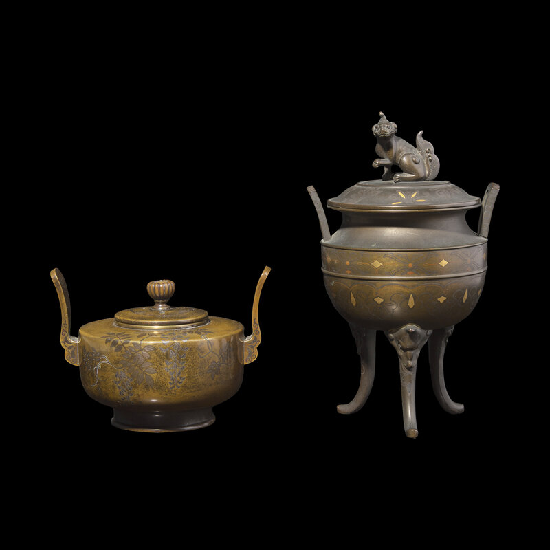 The first by the Nozawa Company, inlaid with silver and patinated metals depicting a flowering wisteria vine and swallows, company mark to underside, incised signature to the side; the second on three curved legs, the cover with kirin finial, the body inlaid with various patinated metals and silver wire, unmarked.
