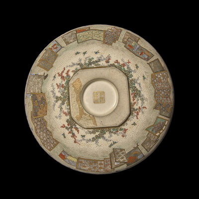 Signed Hankinzan do sei, the interior is lushly decorated with a central scene of numerous figures in an interior with elaborate screens and furnishing, a border of antiques and decorative objects above, exterior with a border of numerous butterflies above various folding screens and birds with flowers.