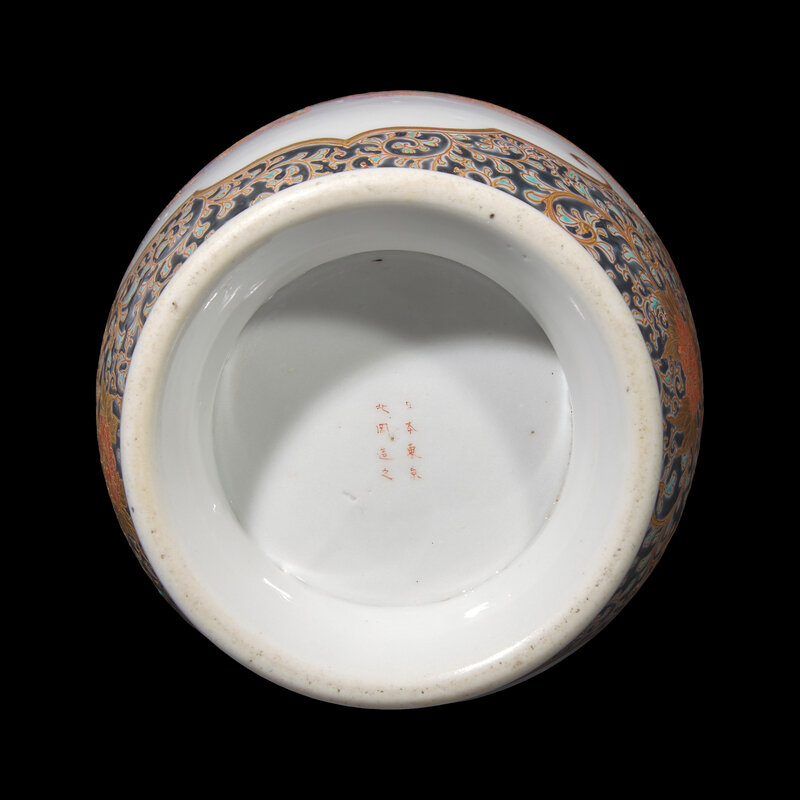 Finely decorated on one side with a dragon, the other with a leaping shishi and peonies, separated by elaborate 'brocade' lappets and medallions, underside inscribed Nihon Tokyo Kitaoka zo no.