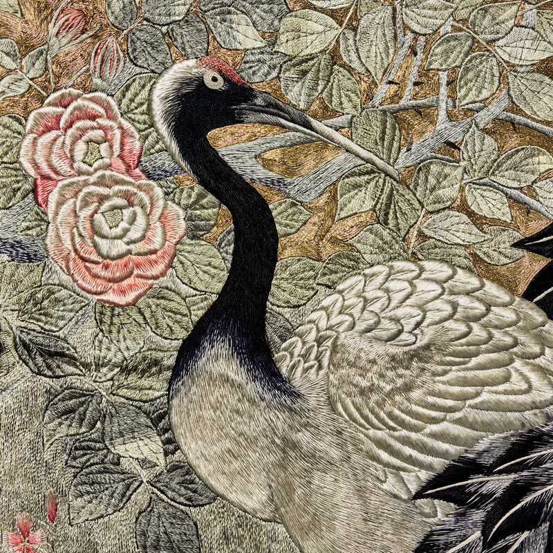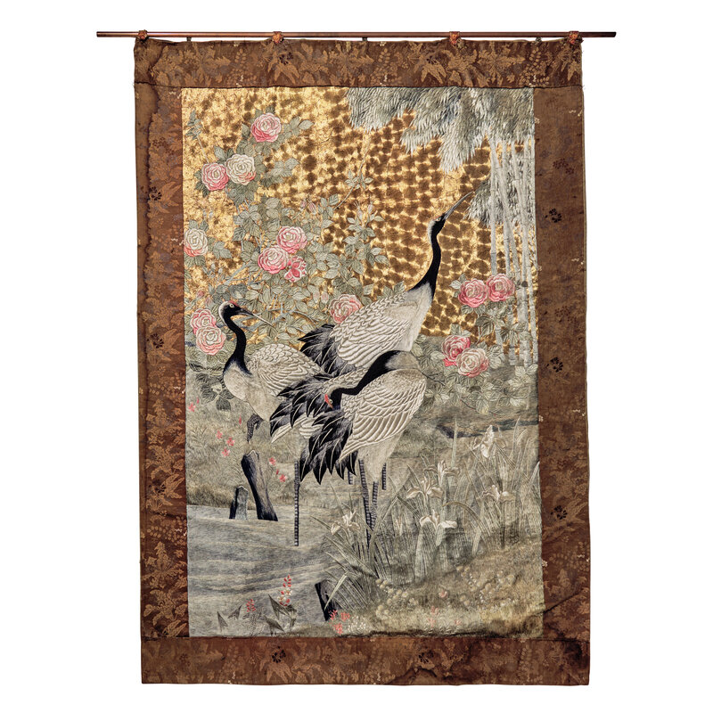 A Large Japanese Embroidered 'Cranes' Wall Hanging, Meiji/Taisho Period