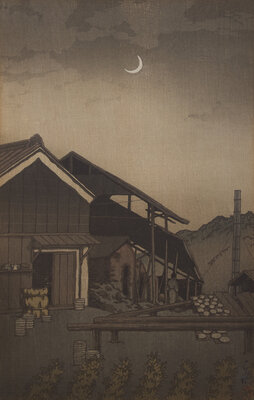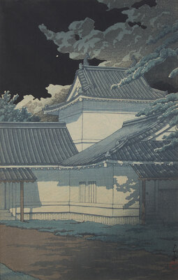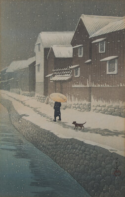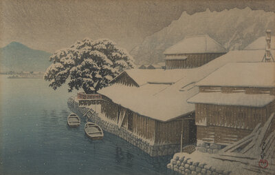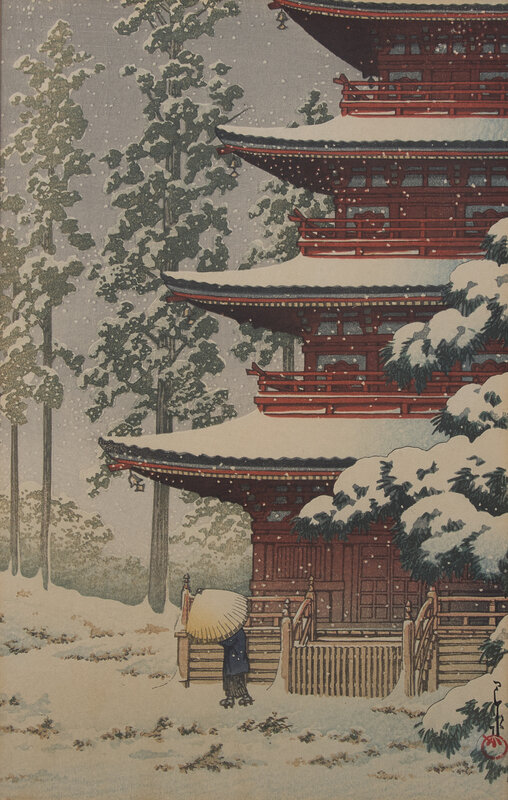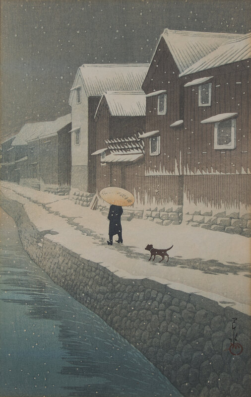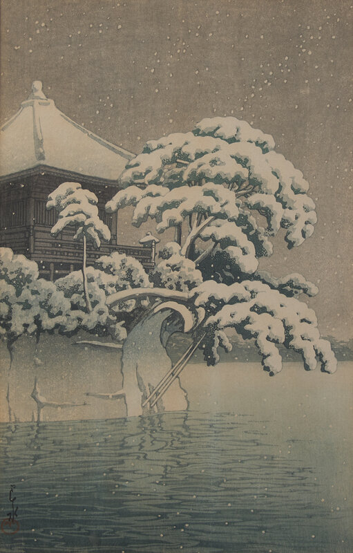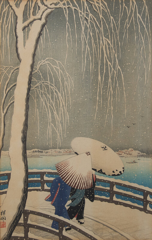 Comprising six Kawase Hasui prints: Aoba Castle, Sendai; Snow at Shinkawa-bata, Bishu; (both matted and unframed); Saisho-in Pagoda-Temple in Snow, Hirosaki; Snow at Godaido Temple in Matsushima; Selection of the Veiws of Tokaido:Bishu, Seto Kilns; Nakaze Island, Kyukitakami River (All framed, matted and glazed); and Ohara Koson: Willow Bridge, Yanagibashi (framed, matted, and glazed).