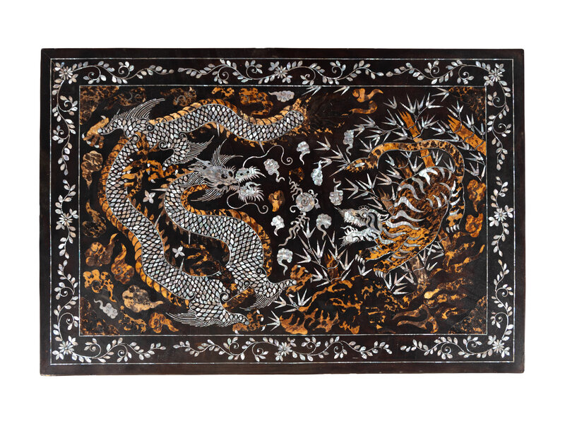 Of kang table form, the top inlaid with a tiger and a dragon, all above recessed waist over protruding beaded and shaped apron, inlaid to show sprigs, terminating in a hoof foot.
