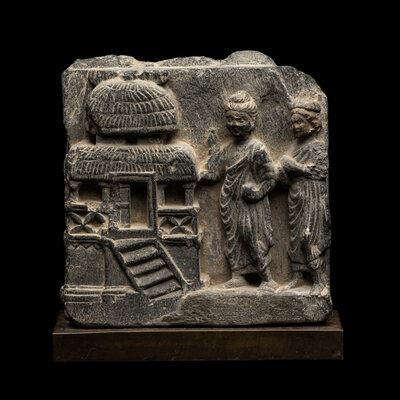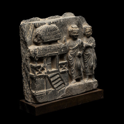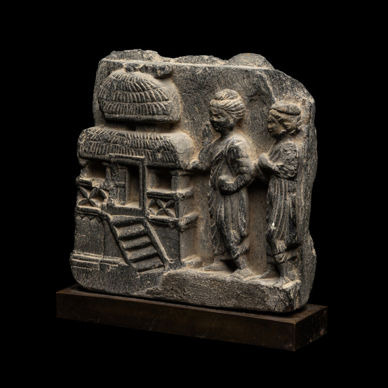 三-四世紀 犍陀羅灰片岩佛祖尋訪圖石雕殘片