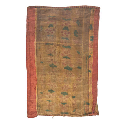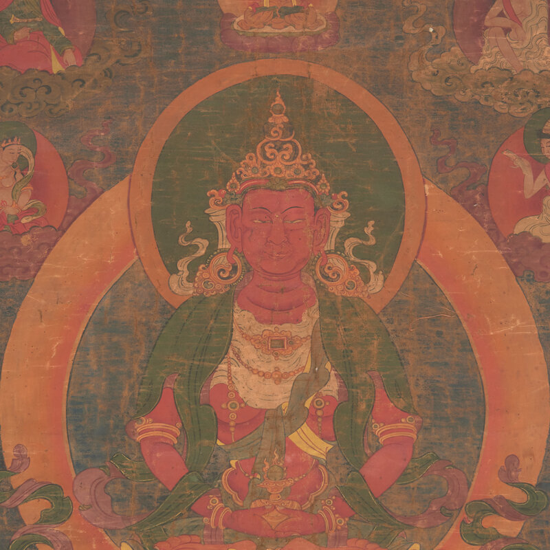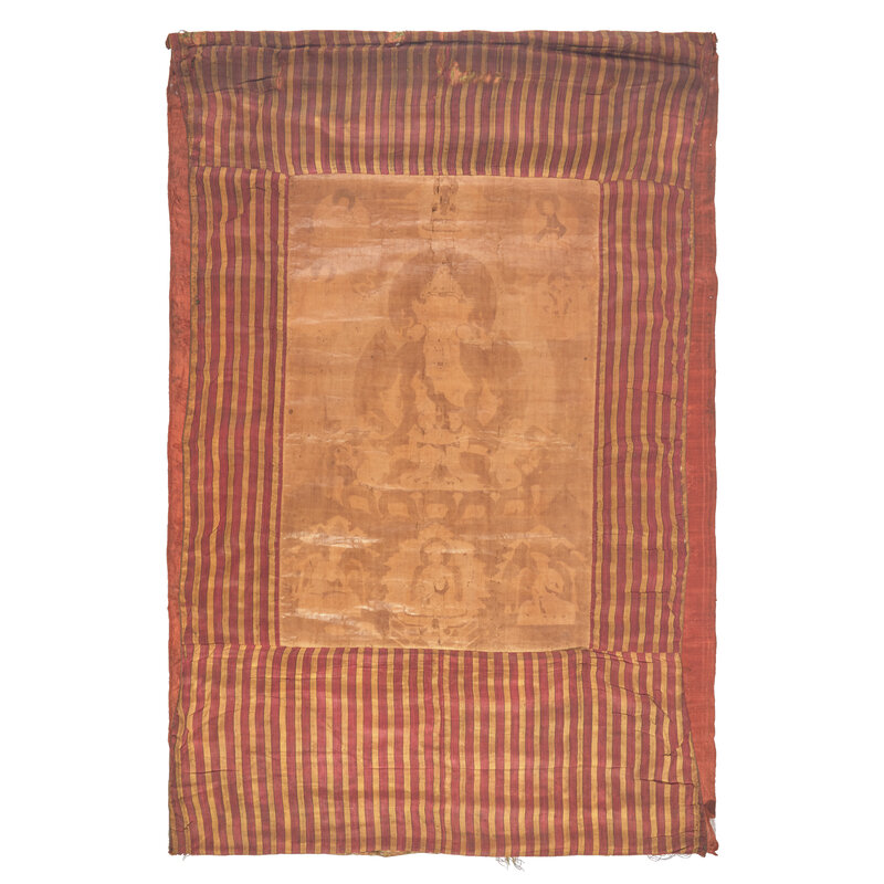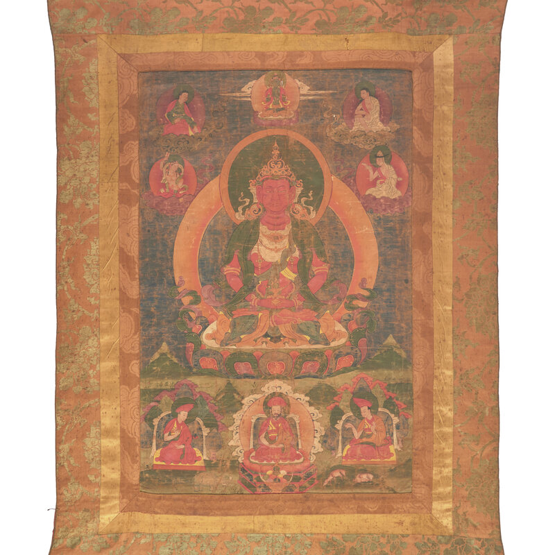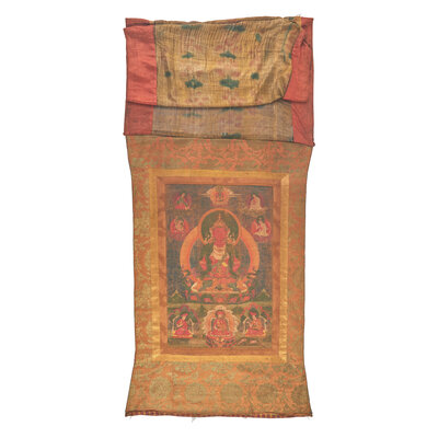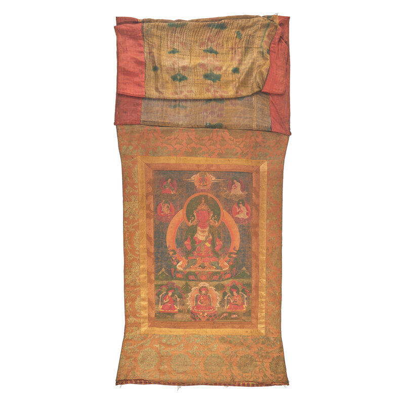 With a stenciled silk veil, the central Tathagata seated on a colorful lotus throne with a cup and jewel in his hands, surrounded by a spiritual entourage including three red-capped lamas below, probably Kagyu, the central figure possibly Ngawang Namgyal (1594–1651); silk mounts.