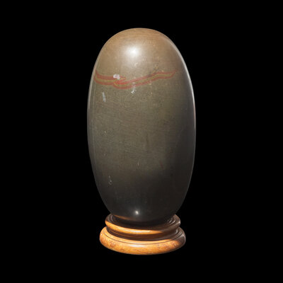 Of typical ovoid form, of fine grey-brown stone with two reddish arched inclusions and a fine vertical pale grey line, varied striations, later turned wood stand.