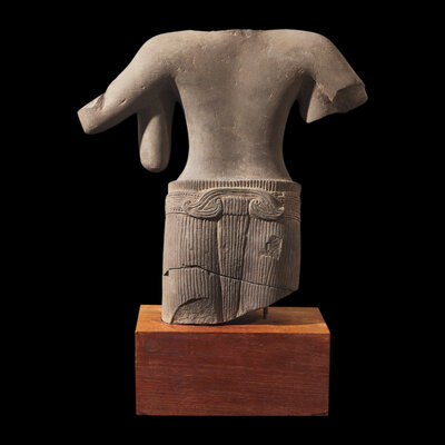 The torso with softly-defined musculature, and remnants of four arms; wearing a pleated sampot with an oval-pattern-carved belt, with a wide overhanging front flap at the waist, above remnants of a double-"fishtail" pendant sash, a series of sweeping curves to one side, verso with a “butterfly” gather; later wood base.