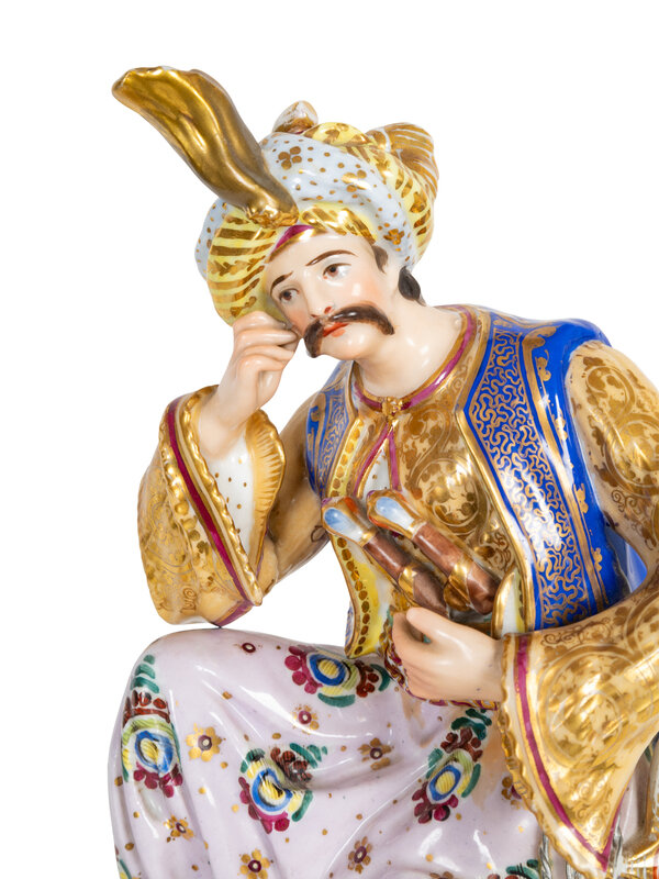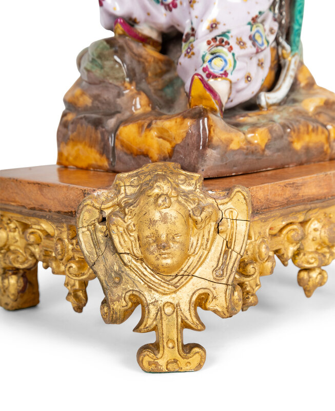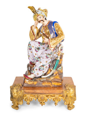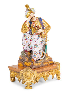 Modelled as an Ottoman Turk resting on an outcropping of rock, together with an associated faux marble and giltwood stand. The figure is in two sections which separates at the waist.