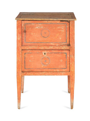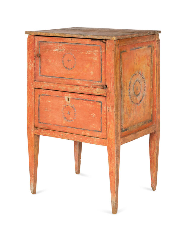 The whole with a red-painted surface, likely original, door opening to compartment above single deep drawer.