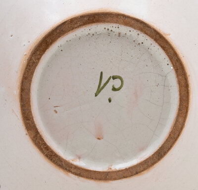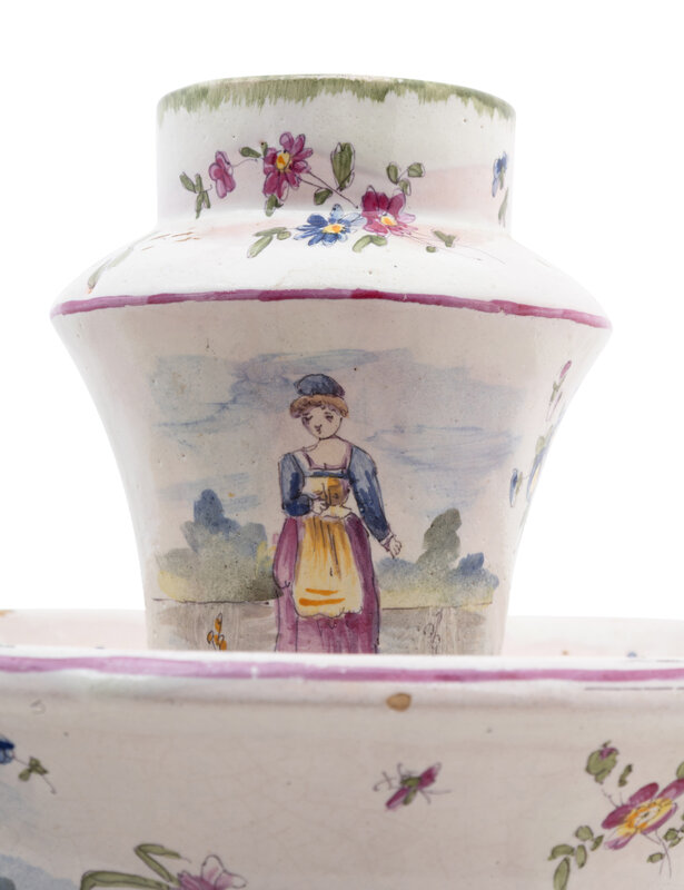 Painted with pastoral figures and floral sprays, marked 'VC' to the underside
