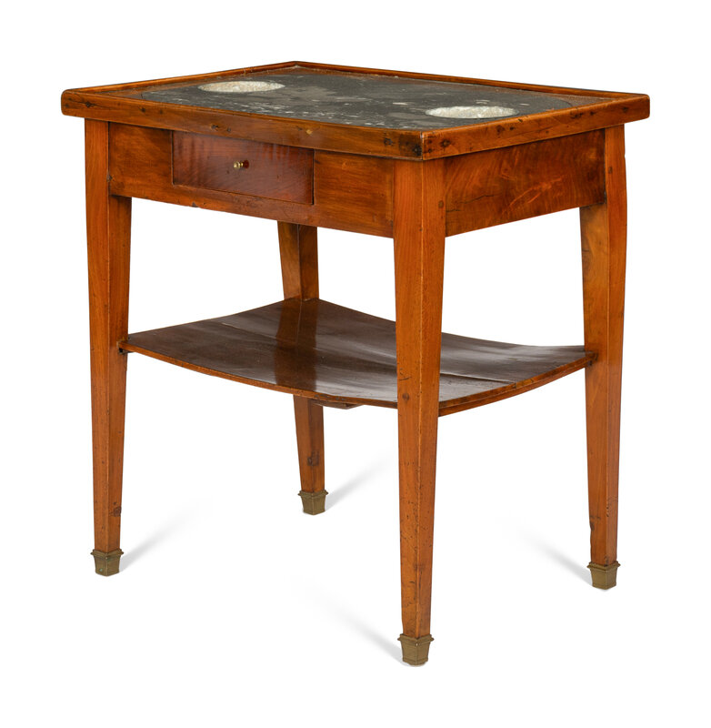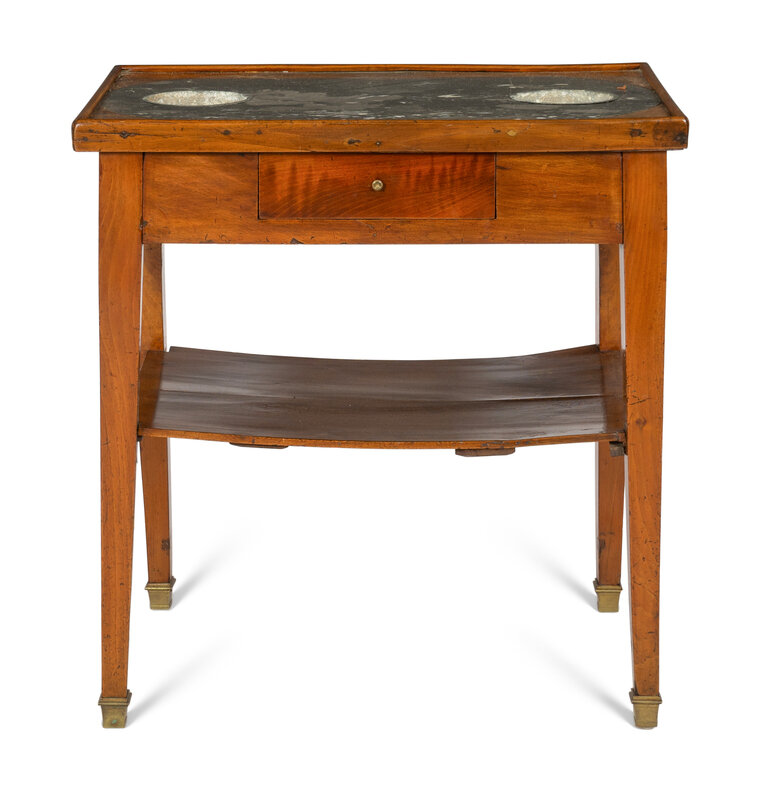 The mahogany top with inset fossilized marble, fruitwood apron with single drawer, square tapered legs connected by stretcher shelf.