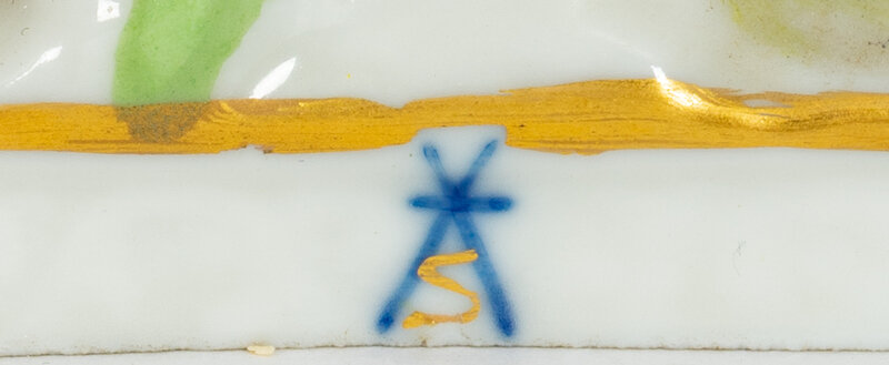 Three figures brandishing swords, and the fourth playing a guitar; two figures with spurious blue crossed-swords mark and gilt 'S'