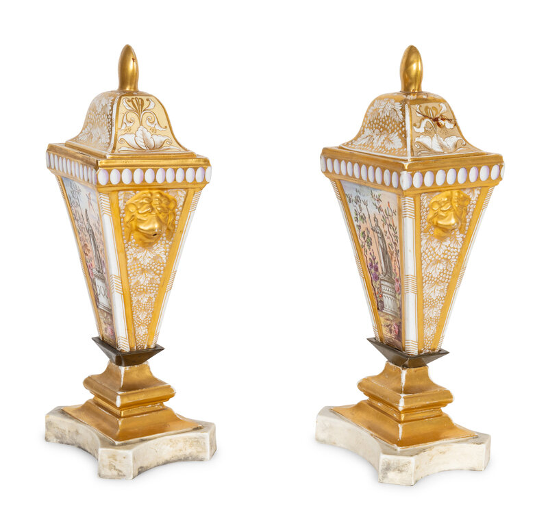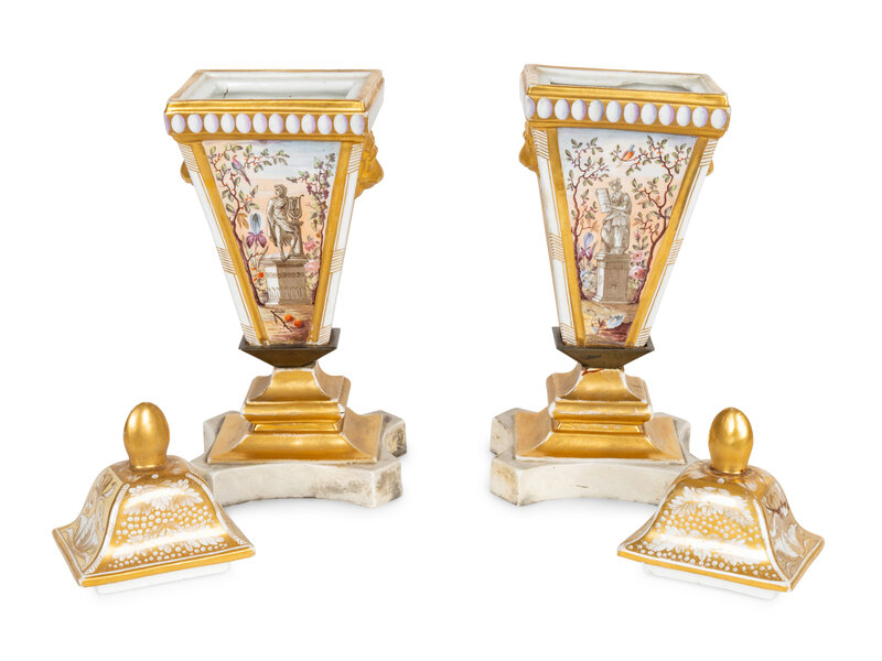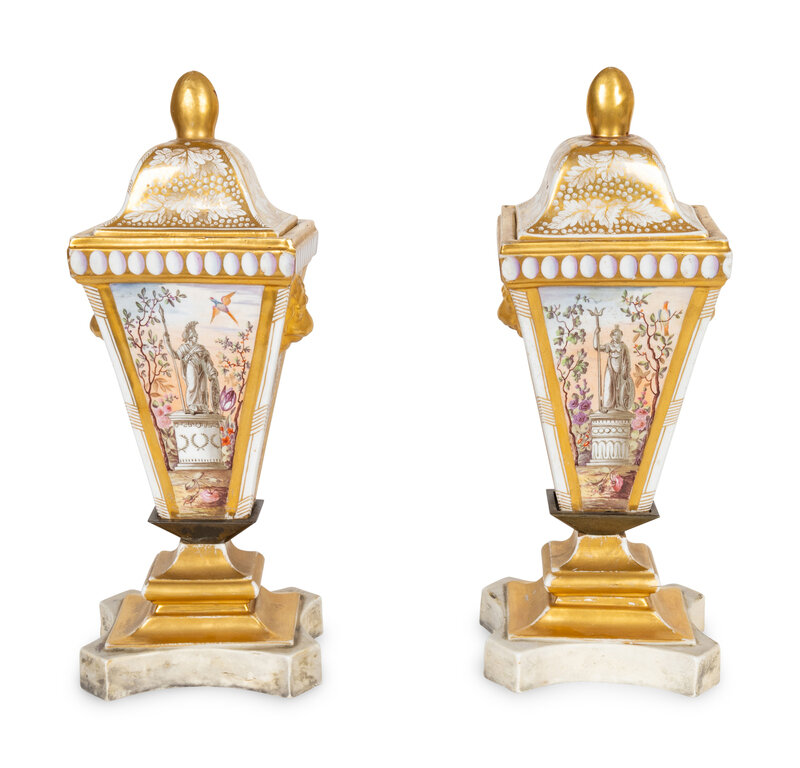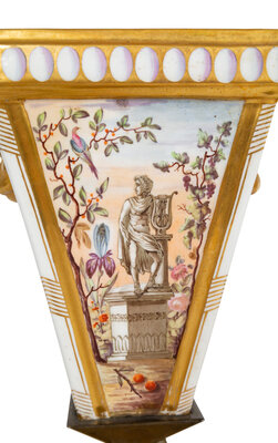 Each painted with a Classical statue at dusk and flanked by lions' heads