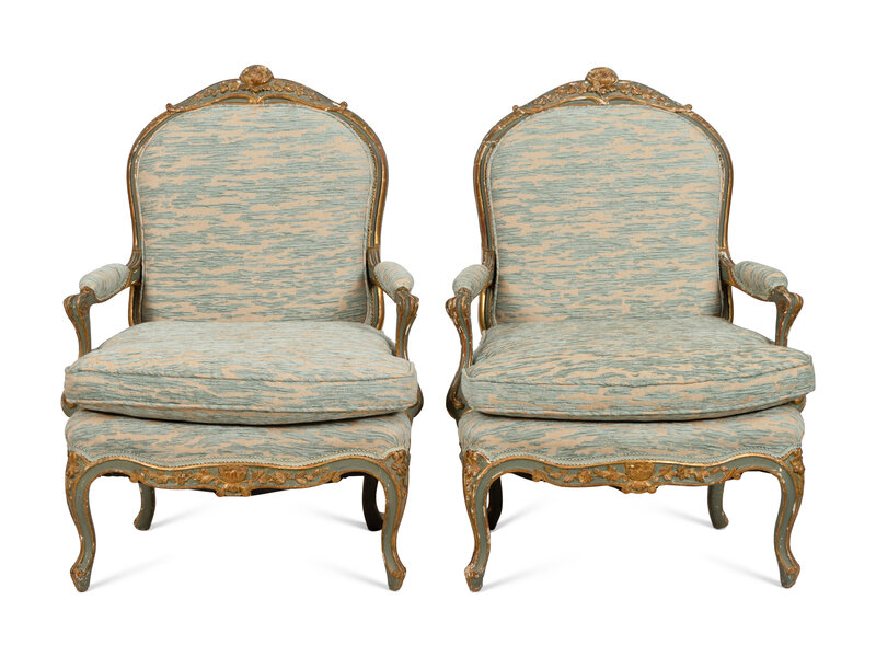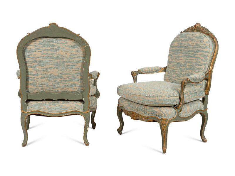 A Pair of Louis XV Style Green-Painted and Parcel Gilt Fauteuils
