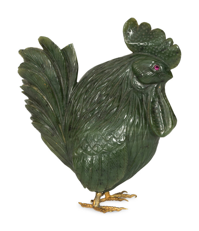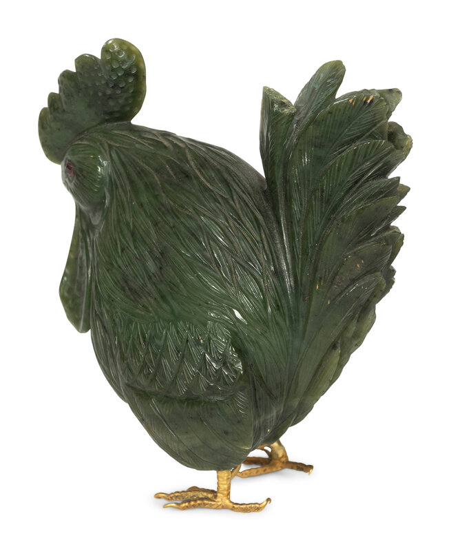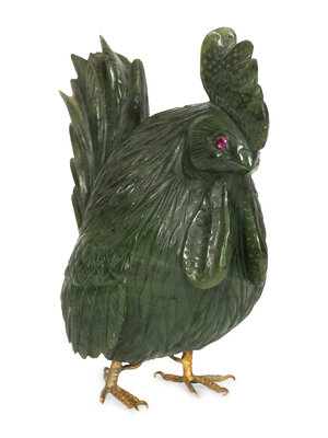A Carved Spinach Jade and Jewel-Mounted Model of a Rooster