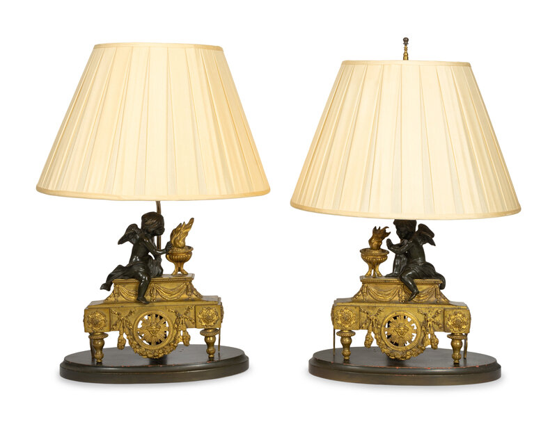 Mounted as lamps, the backs stamped PCCF. With almond bell-form pleated silk shades.