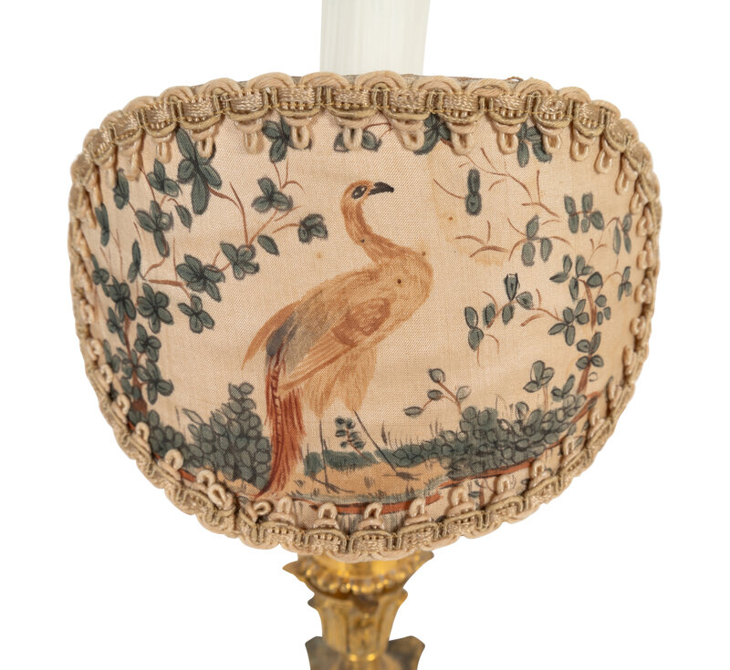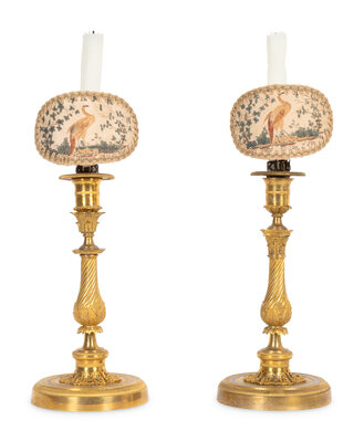 The baluster stems modeled with Corinthian capitals atop socle base; together with a pair of hand-painted silk candle shades.
