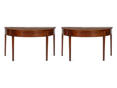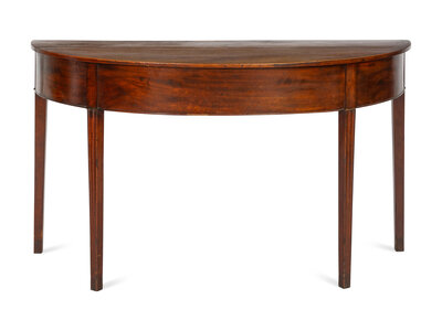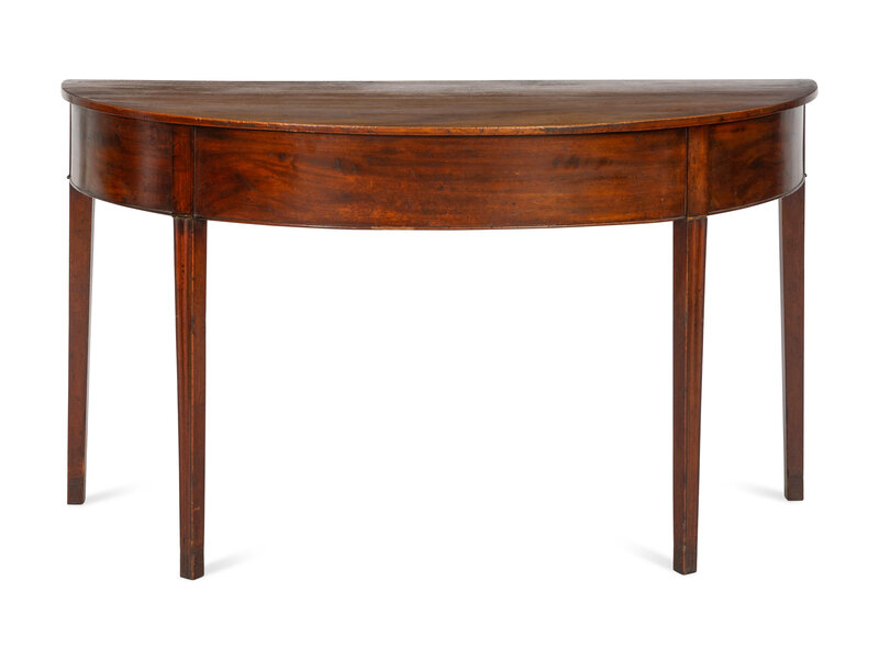 converting to a banquet table with a single leaf and two demilune shaped console tables.