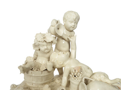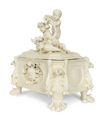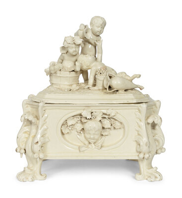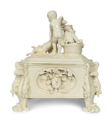 The lid modeled with Bacchic putti and satyr, the base with foliate rocailles