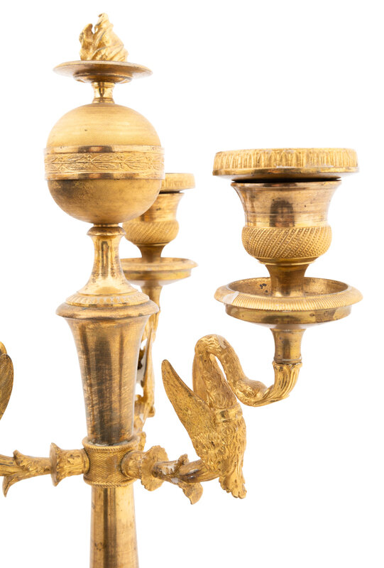 Each modeled with a flame finial issuing from a globe banded by laurel wreaths, each socket issuing from a swan-form branch on pedestal base