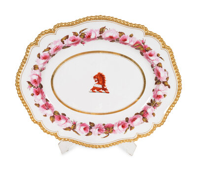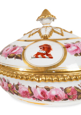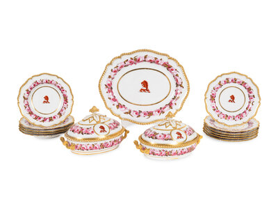 Each painted with blooming roses and centering a blazon with lion's head wearing an ermine collar atop a baton, comprising: a pair of three-part entrée dishes, a serving platter, six dinner plates and five soup plates