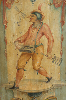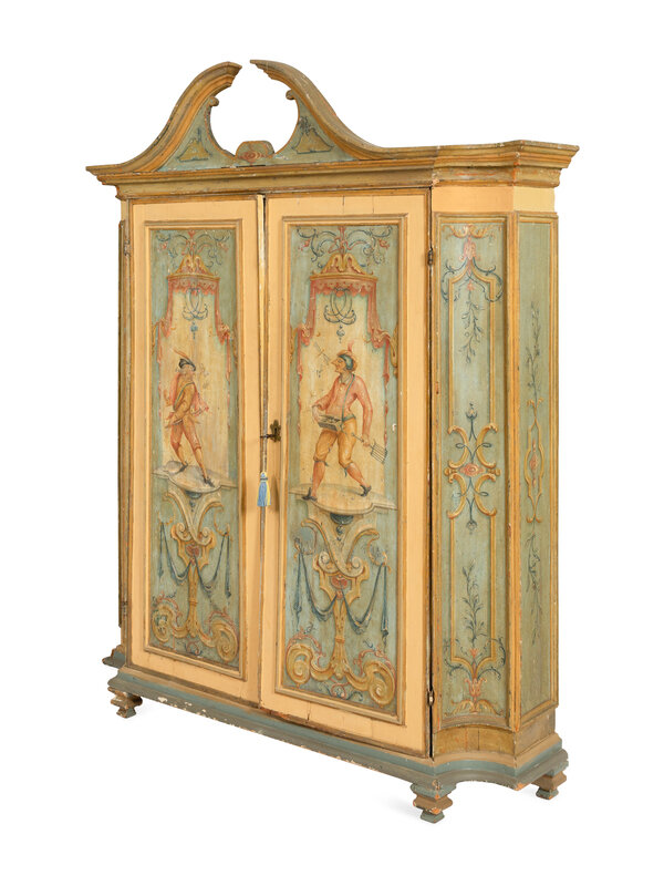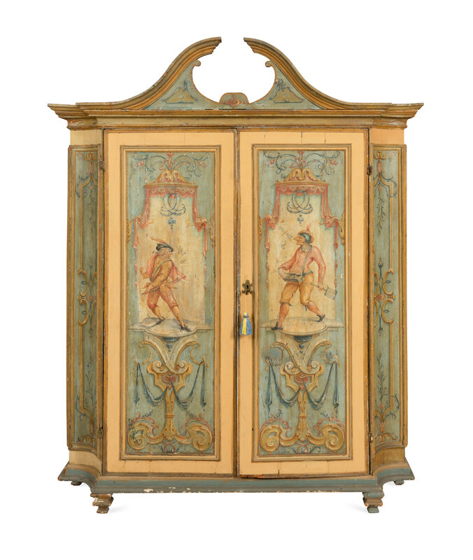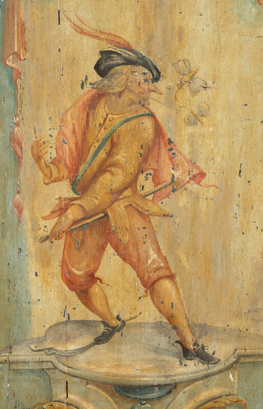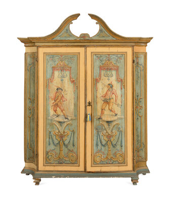 Exterior panels painted with commedia dell'arte figures, the interior later fitted for use as a bar cabinet.