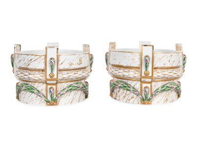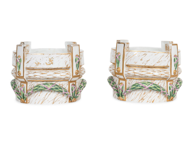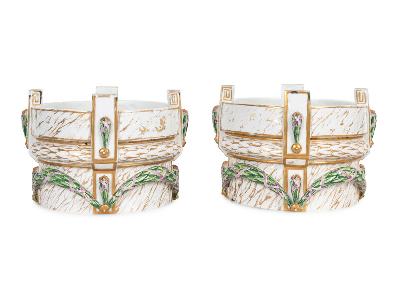 Modeled as faux marble hung with laurel swags, with spurious crossed swords marks in underglaze blue.