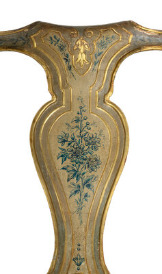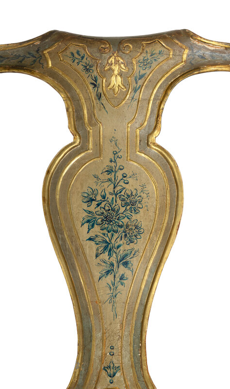 Each yoke-form crest rail over baluster splat painted with floral bouquets, slip seats upholstered in Fortuny fabric.