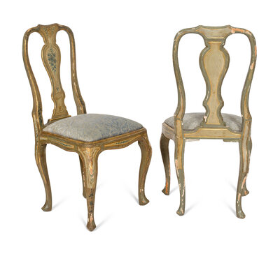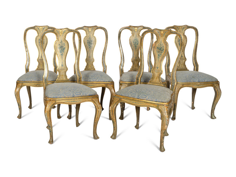 A Set of Six Italian Rococo Polychrome-Painted and Parcel-Gilt Dining Chairs