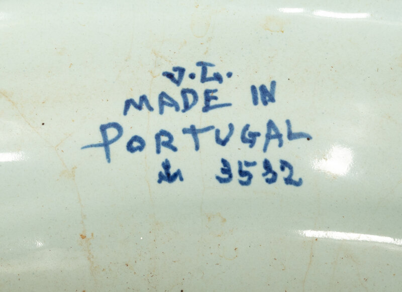 Blue and white glazed with classical motifs and figural handles. In two sections. Each urn bearing marks to their interiors, V.L., Made In Portugal.
