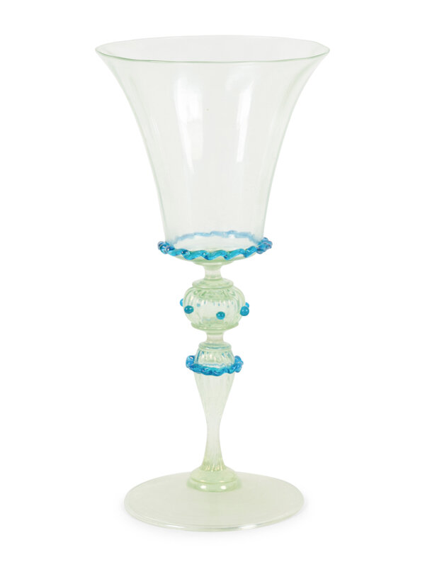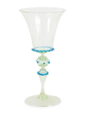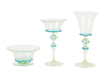 Modeled from green glass with blue accents, comprising: Ten water goblets, ten wine glasses, and six finger bowls