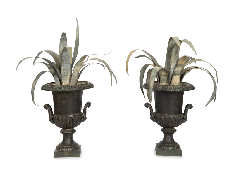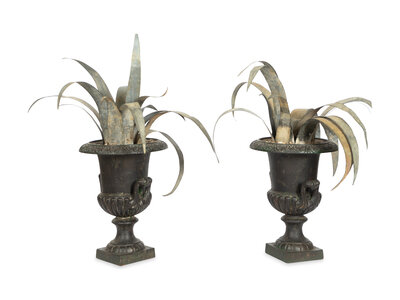 A Pair Cast Iron Urns with Tole Palm Topiaries