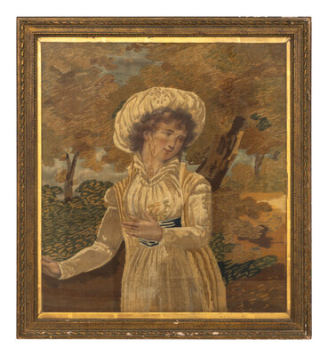 A very large watercolored silk, silk and chenille embroidered portrait of a woman in a landscape, worked predominantly in satin stitch and laid down on linen -- 24 1/4 x 22 1/4 inches.