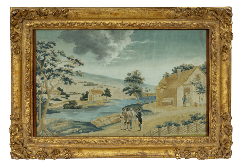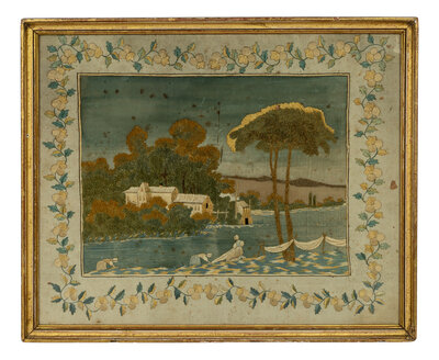 A very fine small watercolored silk and silk embroidered pastoral scene with a river, worked predominantly in satin stitch -- 10 x 14 1/4 inches, framed