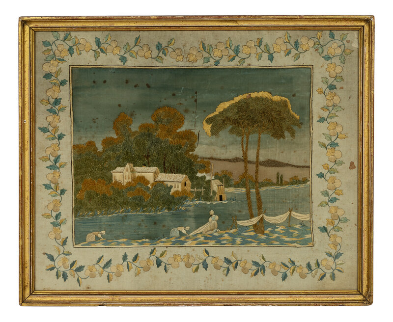 A small watercolored silk, silk and chenille embroidered landscape with women doing laundry in a river, worked predominantly in satin stitch -- 13 x 15 1/2 inches, framed