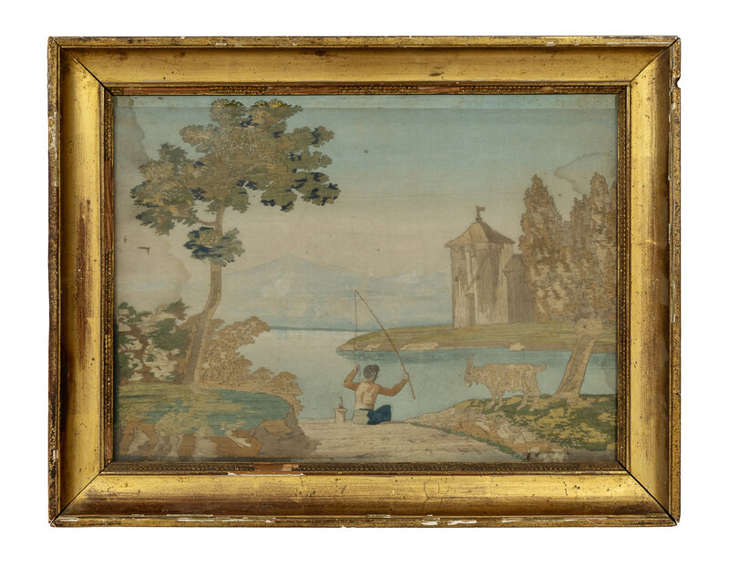 A large watercolored silk and embroidered pastoral scene with a man fishing -- 17 1/4 x 22 1/4 inches, framed