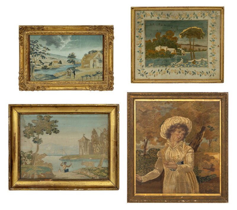 Four Continental Silk Needlework Pictures in Giltwood Frames