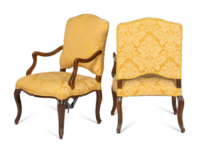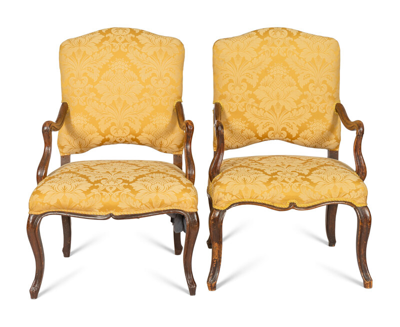 Upholstered in a gold damask, scrolling arms atop cabriole legs.