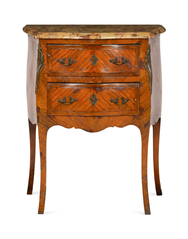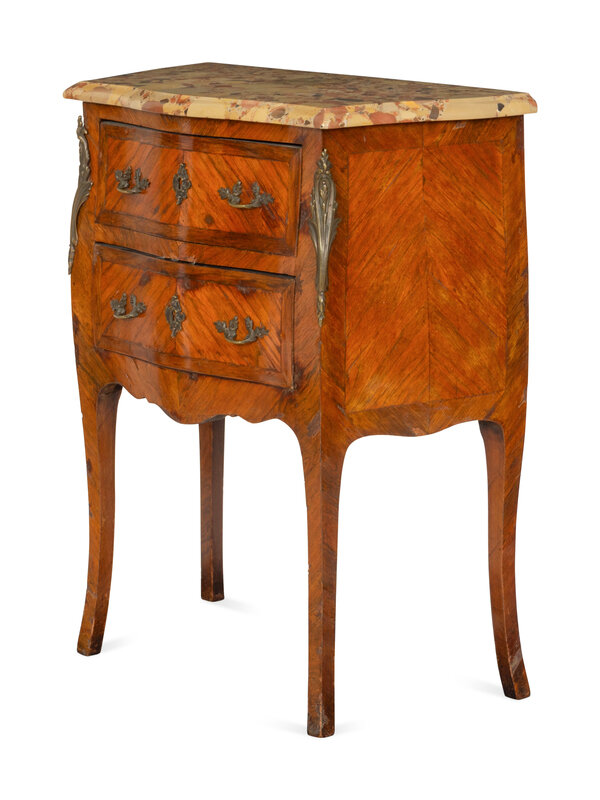 A Louis XV Style Tulipwood-Veneered and Gilt Bronze Mounted Marble-Top Commode