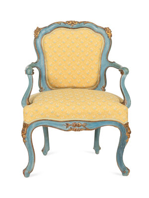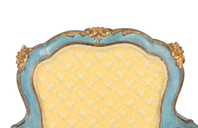 The serpentine tablet back continuing to scrolling arms atop cabriole legs.