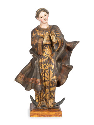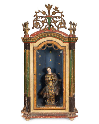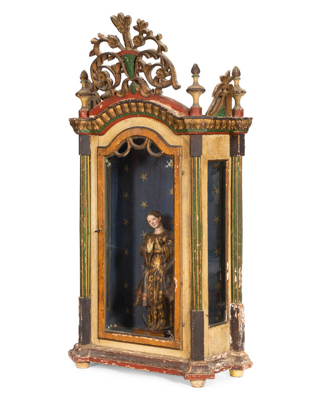An Italian Polychrome Decorated Reliquary Cabinet with Carved Virgin of Guadalupe Figure