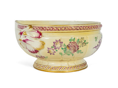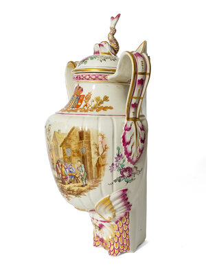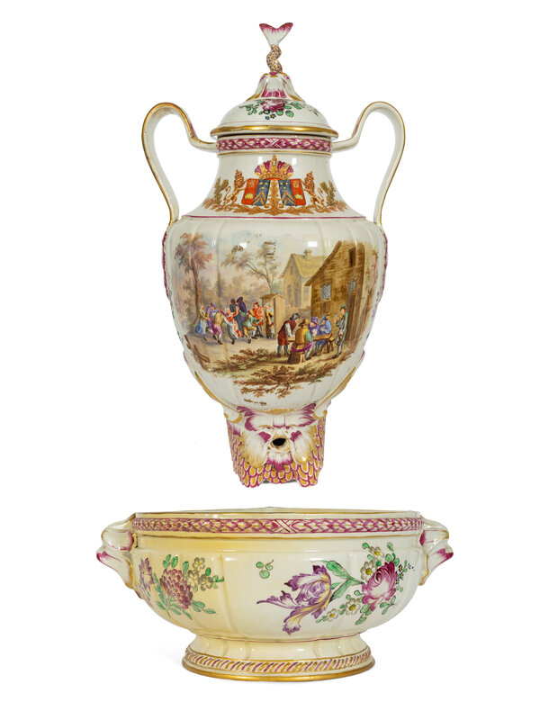 A Continental Polychrome Decorated Parcel Gilt Faience Corner Lavabo and Basin