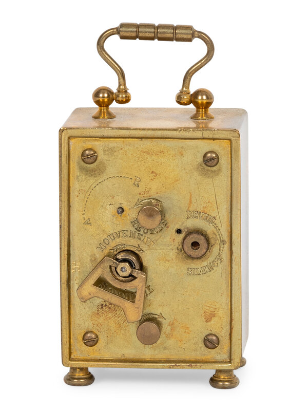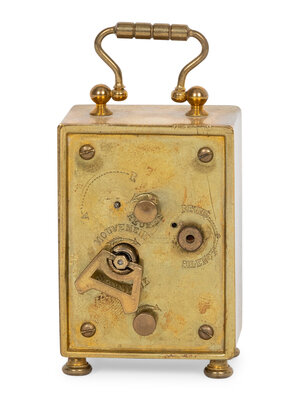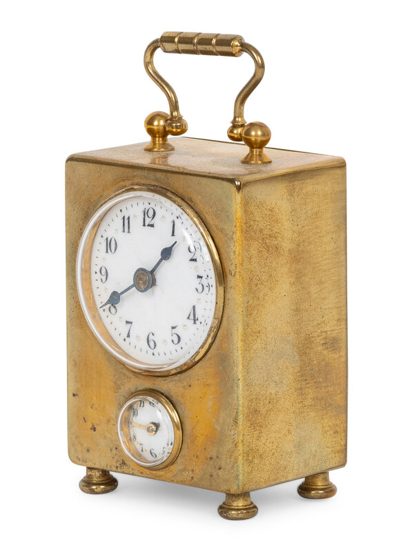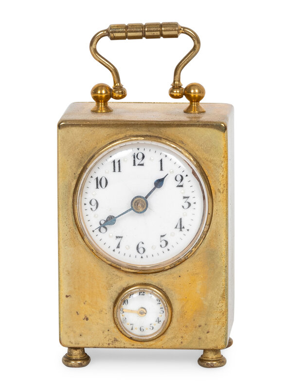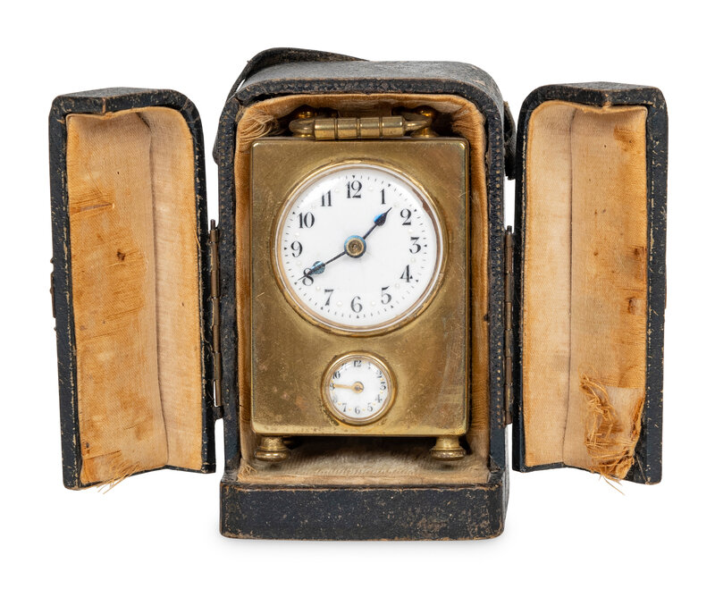 Two dials with Arabic numerals set into a brass case, with original fitted case
