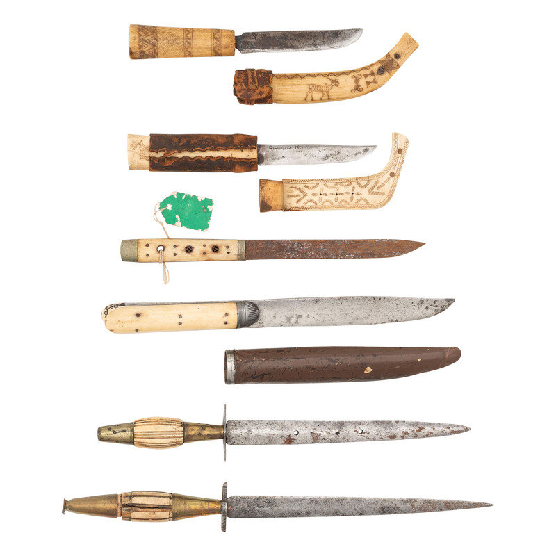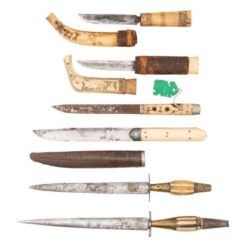 4.) Sami knife - 4" blade. 9" overall. Single edge straight point blade. Hilt and scabbard are both made of ivory or bone, with a leather guard wrapping. Both scabbard and hilt are carved with regional designs and reindeer.